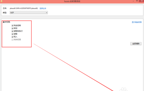 将hosts的权限项目界面下的基本权限的所以项目都勾选上,然后点击确定,如下图所示。