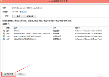 在hosts的高级安全设置界面点击更改权限,如下图所示。