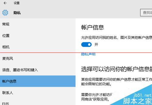 在 Windows 10 里,应用程序可以共享你账户的图片、账户名等信息。如果你觉得他们这么做有点过分了,那就关闭这种共享:“开始”——>“设置”——>“隐私”——>“账户信息”。