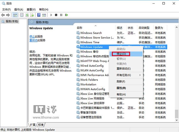 2、找到Windows Update服务,并将其停止(可在服务名称上点右键,选择“停止”;或点击左侧的“停止此服务”)
