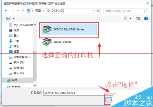 5、这时出现了远程共享的打印机,选中需要的打印机,并点击“选择”