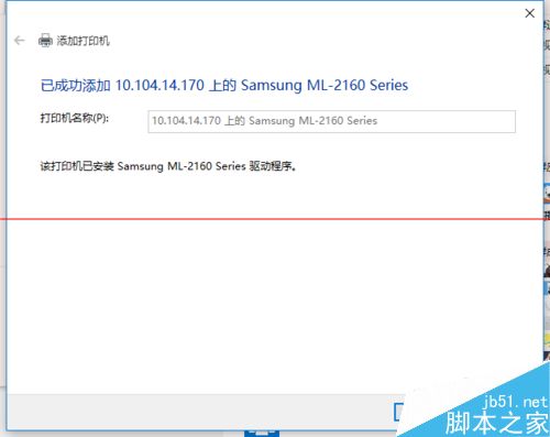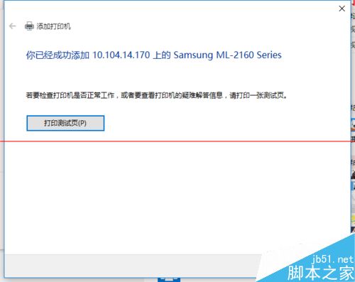 8、安装完成后,在执行一次上面的步骤。我们我们看到,这次的就成功的添加上打印机了。在完成的时候,会有一个打印测试页的按钮,我们不要去点它,直接点击“完成”即可。