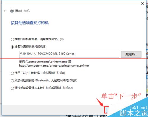 3、这个时候点击“我需要的打印机不在列表中”它,在弹出的新窗口中,可以看到5个单按钮。我们选择第二项“按名称选择共享打印机”,并点击“浏览”。不选择第三项,是因为第三项成功率不高。