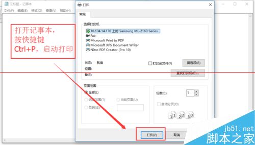 9、秉承不浪费纸张的原则,我们任意打开一个空白的记事本,并点击菜单栏的“文件”,选择“打印”,在弹出的对话框中,选中我们刚才添加的打印机。打印机默认列表中,带有“Document、PDF”字样的均为虚拟打印机,并不是真实的打印机,大家记住了。