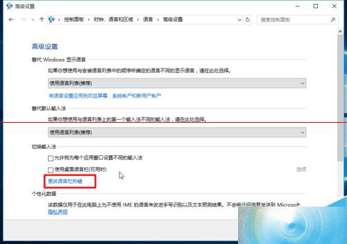 5、点击更改语言栏热键;