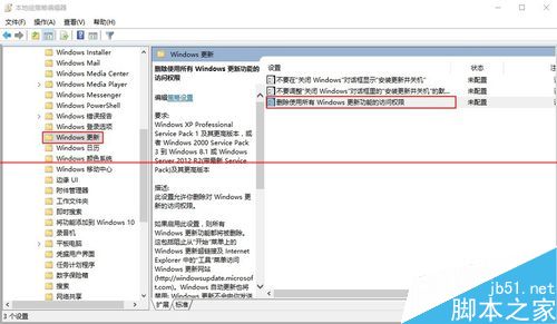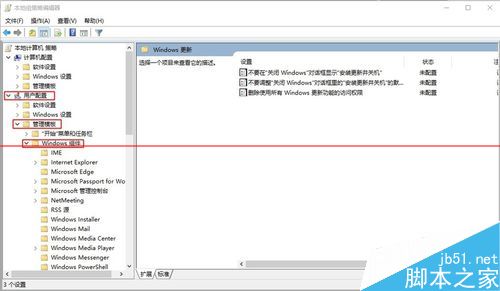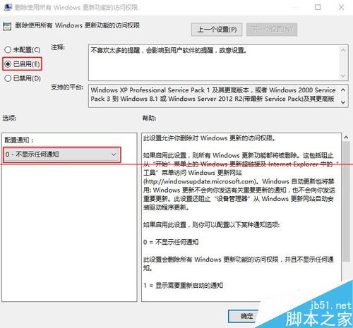 3、以上步骤完成,再看右边栏,选择“用户配置”下的“管理模板”,顺序同上,“管理模板>>Windows组件>>Windows更新>>删除使用所有Windows更新功能的访问权限”,继续选择“已启用“,并同时选择”0 - 不显示任何通知“单击”应用“保存,此步骤用于屏蔽微软的更新提示。
