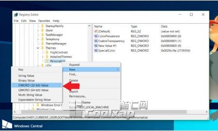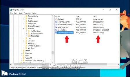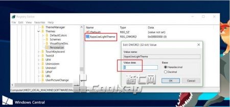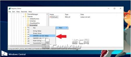 重复上述步骤,只是这次的路径是HKEY_CURRENT_USER SOFTWARE Microsoft Windows CurrentVersion Themes Personalize。再一次,创建一个新AppsUseLightTheme的双字节(32-bit)键值,赋值为0。