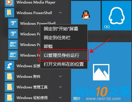 2. 我们可以直接在开始菜单的“所有应用”中找到“Windows PowerShell”文件夹下的“Windows PowerShell”,右单击在弹出的菜单中选择“以管理员身份运行”即可;