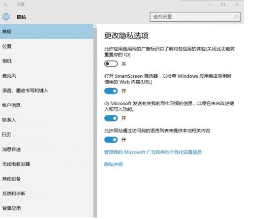 如果你已经安装了Windows 10而没有进行上面的设置,那么你还可以选择在设置页面的隐私选项中进行设置。