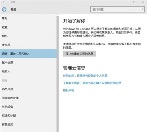 进入“语音、墨迹书写和键入”选项,然后点击“停止收集有关我的信息”,这样就能关闭Cortana和语音听写功能。