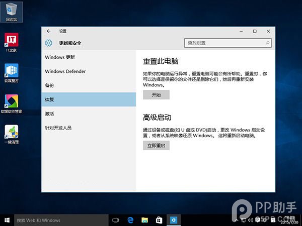 ▲打开设置—更新和安全—恢复—点击高级启动中的“立即重启”