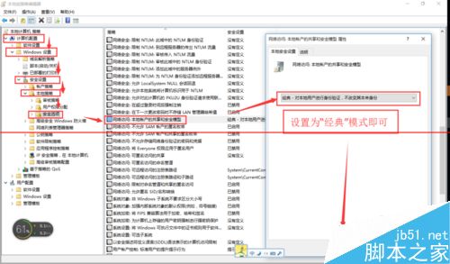 2、“计算机配置”→“Window设置”→“安全设置”→“安全选项”→“网络访问:本地账户的共享和安全模型”→设置为“经典-对本地用户进行身份验证,不改变起本来身份”