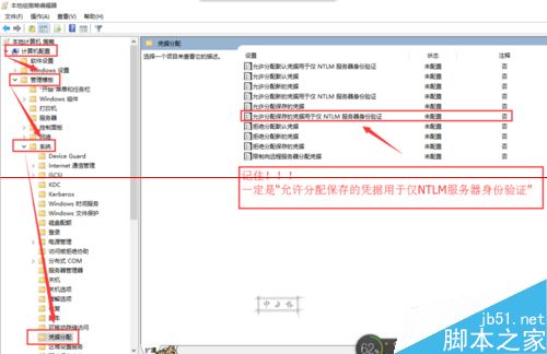 3、依次展开“计算机配置”→“管理模版”→“系统”→“凭据分配”→找到“允许分配保存的凭据用于仅NTLM服务器身份验证”