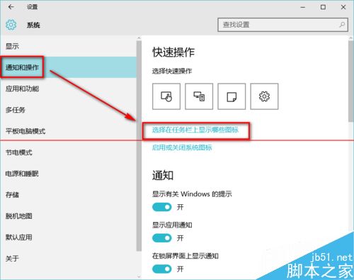 7、在这里我们点击通知和操作——选择在任务栏上显示哪些图标