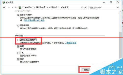 4、接下来从此界面的最下方“关机设置”栏目中,清除勾选“启用快速启动(推荐)”项,点击“保存修改”按钮完成设置。