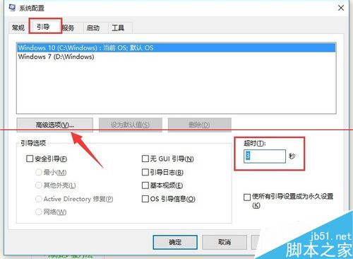 4、切换到“引导”选项卡,将“超时”设置为“3”秒,同时点击“高级选项”按钮。