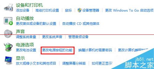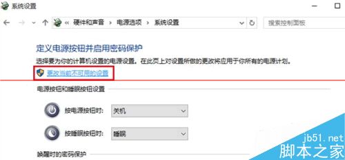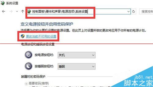 3、从打开的“控制面板”界面中,依次进入“硬件和声音”-“更改电源按钮的功能”界面,点击“更改当前不可用的设置”按钮。