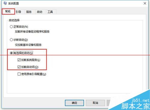 3、在“系统配置”窗口中,切换到“常规”选项卡,勾选“有选择的启动”项,同时勾选“加载系统服务”和“加载启动项”。