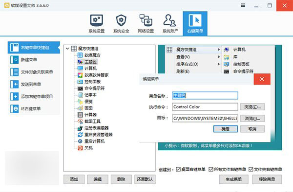 如果你觉得上面的打开方法太麻烦,还可以把这个设置添加到右键菜单。下载软媒魔方(点此下载),打开“软媒设置大师”—“右键菜单”—“右键菜单快捷组”,在这里添加右键菜单。如下图所示,执行命令填写Control Color即可。