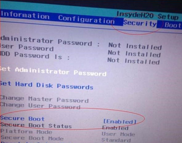 按键盘上下左右键选择各个导航夹,一般在“Security”导航夹内可以找到SecureBoot选项,如下图所示。