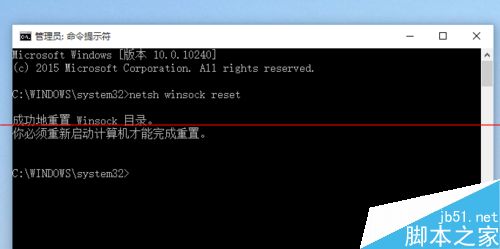2、在弹出的对话框中输入“ netsh winsock reset ”命令,之后按回车键确认。