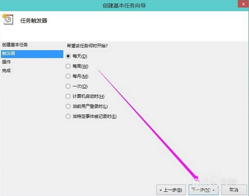 希望任务何时开始,如果是家庭的电脑使用每天是最后的。服务器就要看需要求设置执行任务的时间点。下一步。