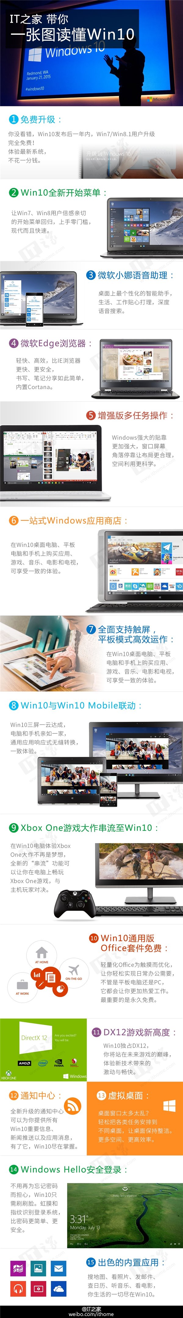 微软最新的Win10正式版将于今晚发布,微软已经向Win7/Win8.1用户推送Win10系统升级文件的预下载,也许还有很多用户对最新的Win10系统不是很了解,还在犹豫要不要升级,为此制作了一张图片,总结了Win10系统的一些亮点,让大家可以一张图了解Win10。下面就详情来看看了解一下吧!