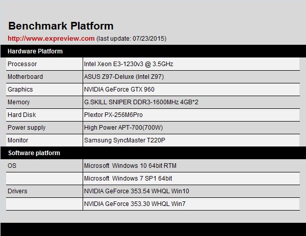 测试平台使用Intel Xeon E3-1230v3处理器,华硕Z97-Deluxe主板,芝奇SNIPER DDR3-16004GB*2内存,显卡是NVIDIA公版GTX 960,系统盘使用浦科特M6Pro 256GB,Windows 10系统使用的是系统更新中心推送下来的353.54WHQL驱动,Windows 7系统则使用现在官网上最新的353.30 WHQL驱动。
