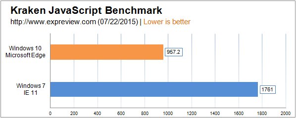 大家可以看到微软Edge浏览器的性能是如此的抢眼,面对IE11是完胜,在Octane 2.0 JavaScriptBenchmark这个项目上微软Edge领先幅度超过了50%!Kraken JavaScriptBenchmark这个项目的优势也将近50%,新的浏览器表现相当值得期待。