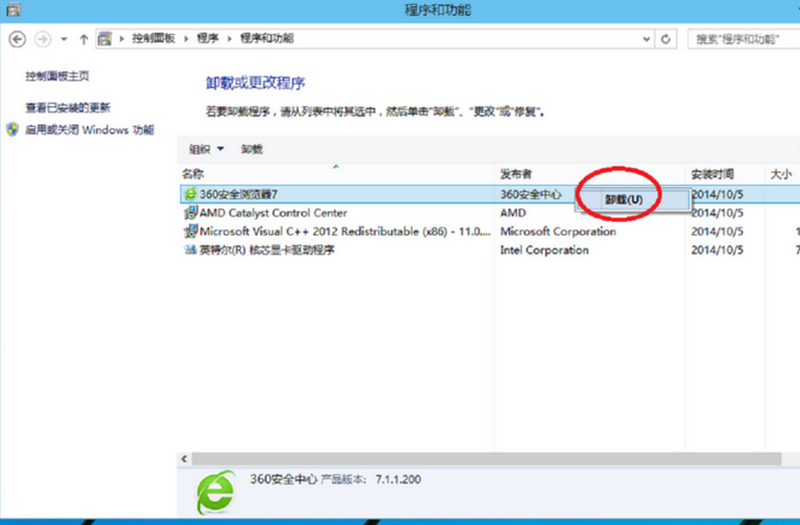 在卸载程序窗口,找到你需要卸载的程序软件,比如360安全卫士,在上面右击--卸载,单击卸载即可。