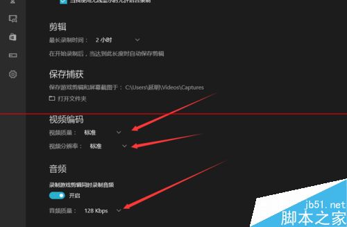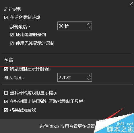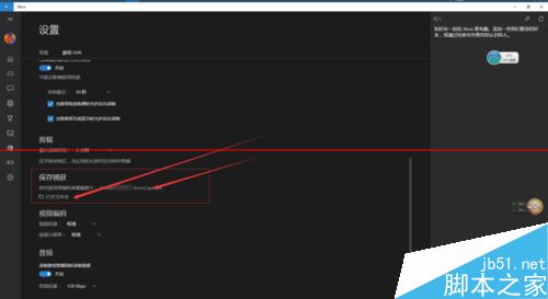 4、在弹出的xbox选项框中,可以看到 很多选项,这里我们主要设置的是 保存的 位置,录制的质量,