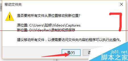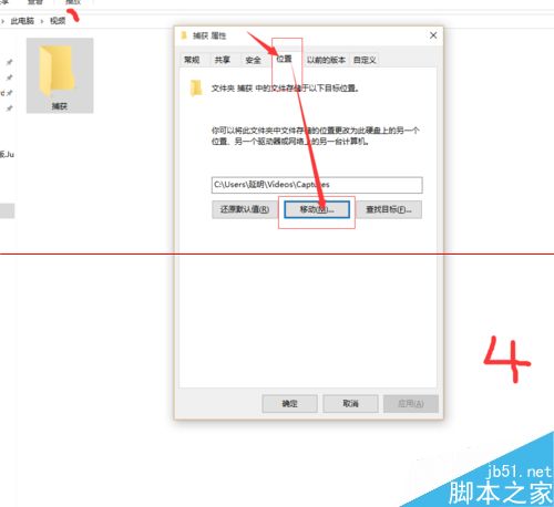 6、打开 该文件夹,之后返回上一级,在捕获文件夹上右键点击,属性,出现对话框中选择位置,点击移动,在弹出的框中,选择你想保存的文件夹位置。之后应用,是,确定。