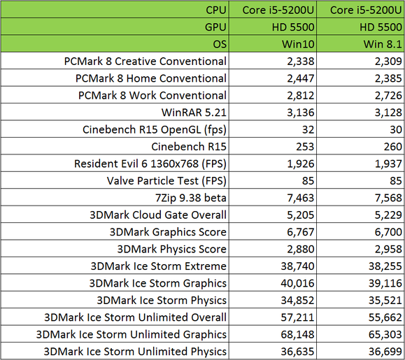 为确保测试的公平性,外媒测试团队使用了两台相同规格的惠普Spectre X360笔记本,采用相同的屏幕和电池,相同的8GB LPDDR3内存、128GB SSD存储,英特尔Core i5 -5200处理器,相同的BIOS版本,只是其中一款安装了Windows 10 Build 10240版本,而另一款安装了Windows 8.1 家庭版。测试项目包含文件压缩、性能跑分、3D渲染和DX9和DX11的一连串跑分,测试软件包括PCMark 8,WinRar、CineBench, Valve’s old Particle Test, 7Zip, Passmark 和3DMark等等。