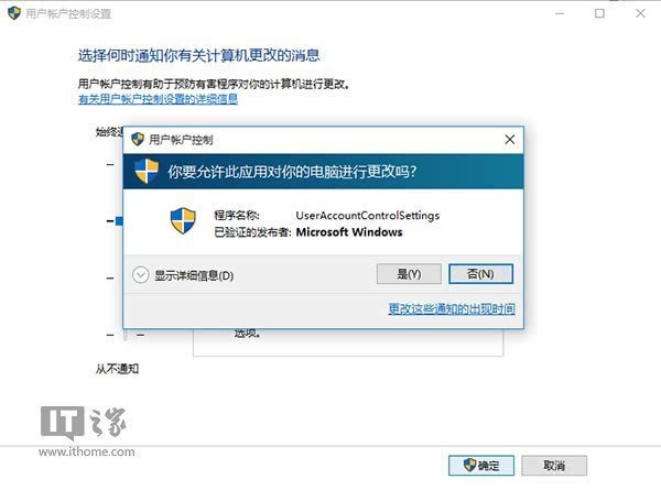▲在控制面板(Win32程序)将UAC通知级别调高,授权提示正常显示