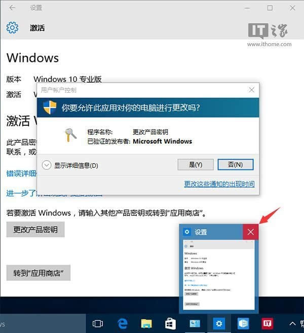 是在测试Build 10240更换Win10激活密钥,以及在应用商店购买Win10专业版密钥的过程中发现这一问题的。这两个任务所涉及的均为Windows应用(“设置”和“应用商店”),而且中间都需要用户对操作进行管理员授权。而在点击例如“更改产品密钥”后却发现窗口假死,但就在想通过任务栏窗口预览关闭应用时,却发现 将鼠标移动到预览窗口的关闭按钮“X”后,出现了UAC窗口预览。不过此时如果把鼠标移动到“X”以外的位置,预览效果就会消失,因此 这种遮挡效果无法解除,通过Alt+Tab等切换方式也无法调出UAC授权对话框。