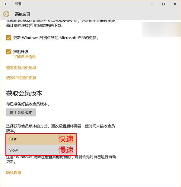 4、点击下拉菜单选择Win10 Insider会员版本更新通道。一般来说,“快速版”推送较频繁,容易更快见到Win10新功能,而“慢速版”推送频率比较低,但更稳定。这两个版本只有上述区别,与“激活”等条件无关。