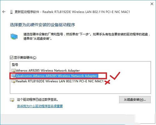 3、选第二个“Qualcomm Atheros AR9285 Wireless Network Adapter”,而不是第三个“Realtek RTL8192DE Wireless LAN 802.11N PCI-E NIC MAC1”;