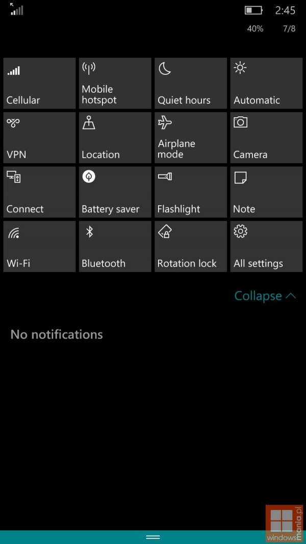 日前微软面向Slow Ring通道用户开放了版本号为10162的Windows 10 Insider预览版下载,而今天相同版本号为的移动端Windows 10截图也在网络上曝光。根据波兰科技媒体提前曝光的数张截图来看,10162版并未带来太过于明显的变化,主要带来了全新的壁纸(包括Hero壁纸)、Store磁贴的细节调整和更大的电源图标等等。