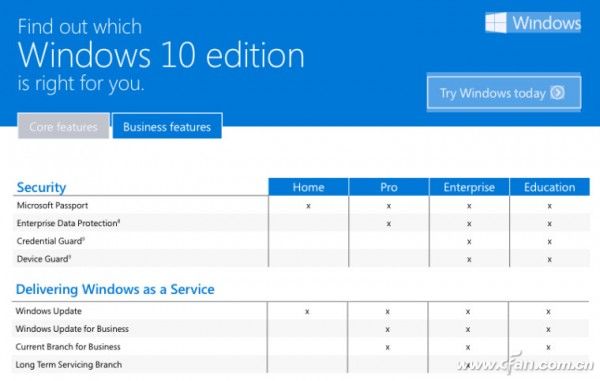 上面这张图详述了Windows 10家庭Home版、专业Pro版和教育Education版之间的差异。实际上,我们发现,企业版和教育版之间的差异只有一项,所以大致上,这张表还是教导人们如何选择家庭版和专业版的。