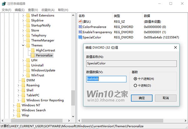 • 在右侧你会发现名为SpecialColor的32位DWORD值,自定义的颜色值就是它了,双击可更改其值。