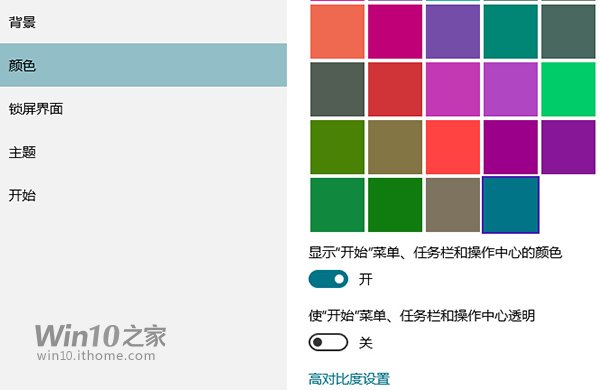 Win10中系统主题色有两个来源,一个是自动从背景图片中选择,另一个是从微软提供的若干颜色中选取。如下图所示: