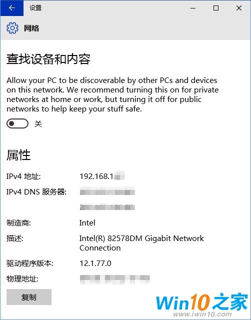 3. 点击你当前已连接的那个网络,便可以看到“查找设备和内容”开关,如果关闭则适用于“公共网络”;如果打开则适用于“家庭网络”和“工作网络”,这里就可以根据自己的需要来进行设置了。
