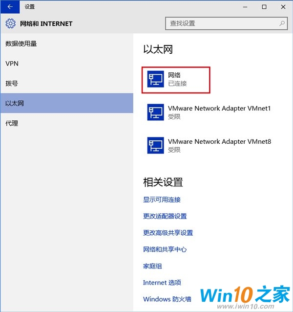 2. 选择第三项“网络和Internet”,点击进入后选择“以太网”,然后便可以看到网络连接了,这里需要注意的是如果你连接的是无线网,那么这里选择“WiFi”选项;