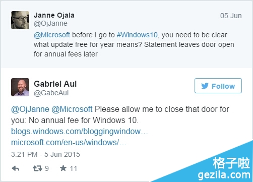 自Windows 10预览版推出以来,外界就纷纷猜测微软会尝试转向类似于Office 365等服务的“订阅式收费”,而这显然会动摇人们升级到Windows 10的意愿。此前,微软曾表示Windows 7和Windows 8.1的用户将能够在第一年内免费升级至Windows 10。不过,为了打消人们的疑虑,微软Insider项目负责人Gabriel Aul已经通过Twitter发表承诺——Windows 10将不会收取年费,希望用户们放宽心!