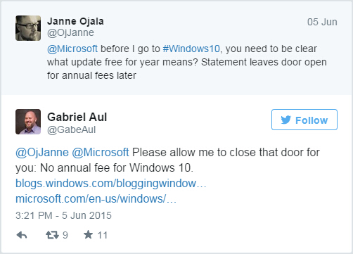 自从Windows 10预览版推出以来,外界曾普遍猜测微软会尝试转向类似于Office 365等服务的“订阅式收费”,而这显然会动摇人们升级到Windows 10的意愿。此前,微软曾表示Windows 7和Windows 8.1的用户将能够在第一年内免费升级至Windows 10。不过,为了打消人们的疑虑,微软Insider项目负责人Gabriel Aul已经通过Twitter发表承诺——Windows 10将不会收取年费!