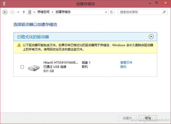 特别提示:创建存储池之前首先要连接外接存储设备,否则无法创建。每次创建的时候都会格式化驱动器,所以如果接入的驱动器中有数据,一定要先备份数据。