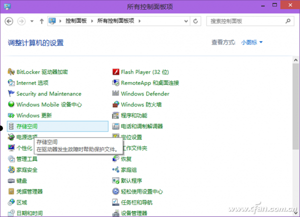 第二步:以“小图标”方式查看控制面板选项,在“所有控制面板项”列表中选择“存储空间”选项,进入“存储空间”创建窗口。