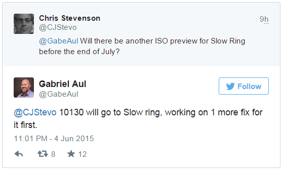 上周,微软向Fast Ring阶段的Insider测试用户发布了Windows 10预览版build 10130,新版本带来了一系列性能和界面的改进,但也同时带来了不少稳定问题,以及未预期的错误。之后微软发布了不少补丁对该版本进行修复,不少问题已经明显改善。Windows Insider项目负责人Gabe Aul又为我们带来了新消息:再完成一个修复补丁后,Build 10130版就会发布至“Slow Ring”用户。