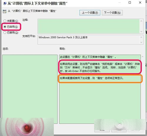 6、在打开的从“计算机”图标上下文菜单中删除“属性”窗口,帮助一栏中显示:如果启用此设置,则当用户右键单击“我的电脑”或“计算机”并转到文件菜单时,不会显示“属性”选项。同样当选择“计算机”时,按Ctrl+Enter不会执行任何操作。
