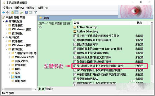 5、在桌面对应的右侧窗口,我们找到:从“计算机”图标上下文菜单中删除“属性”,并可以看到,该项的状态为:已启用,左键双击:从“计算机”图标上下文菜单中删除“属性”;